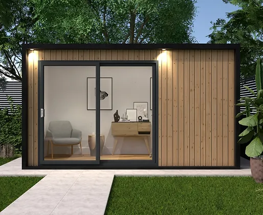 Standard 3 pin sockets are provided just like in your home. There are also smart spotlights recessed into the ceiling, finished with striking patio lights outside. All the wires are integrated within the structure and protected with a consumer fuse box unit in the room. An outdoor outlet on the side of the building allows you to simply run the power cable (provided) to your home plug socket without the need for an electrician. Just plug the room in when you use it. Alternatively, we can arrange an electrician to hard-wire an armoured electrical cable, the price for this will depend on your installation, please contact us for a quote.